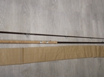 9' carbon fibre fly rod.This rod is in superb condition. It is a carbon fibre rod, 8' long. Although it has no rating on the rod, I think is is a #5. It has a screw reel seat. agate tip ring and snake rings elsewhere and shows little sign of use. It also comes in a rod bag