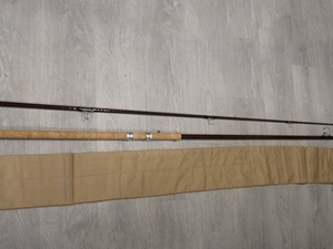 This rod is one with performance to match modern rods but in a retro style. The rod is a 2-piece fibreglass rod with intermediate whippings in the manner of the Richard Walker Mk IV cane rods. It has the traditional cork handle with "doughnut" end with sliding alloy rings and spigot ferrules. It is 12' long and probably around 3lb test curve. I believe it was sold through his shop by Roger Surgay and is unused, and also comes in its original bag